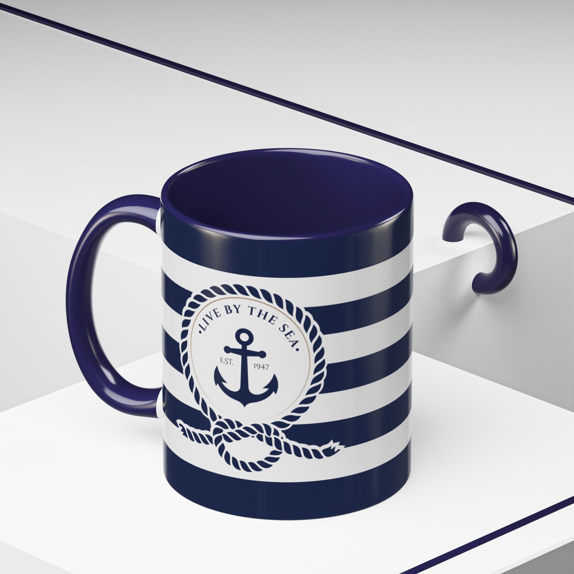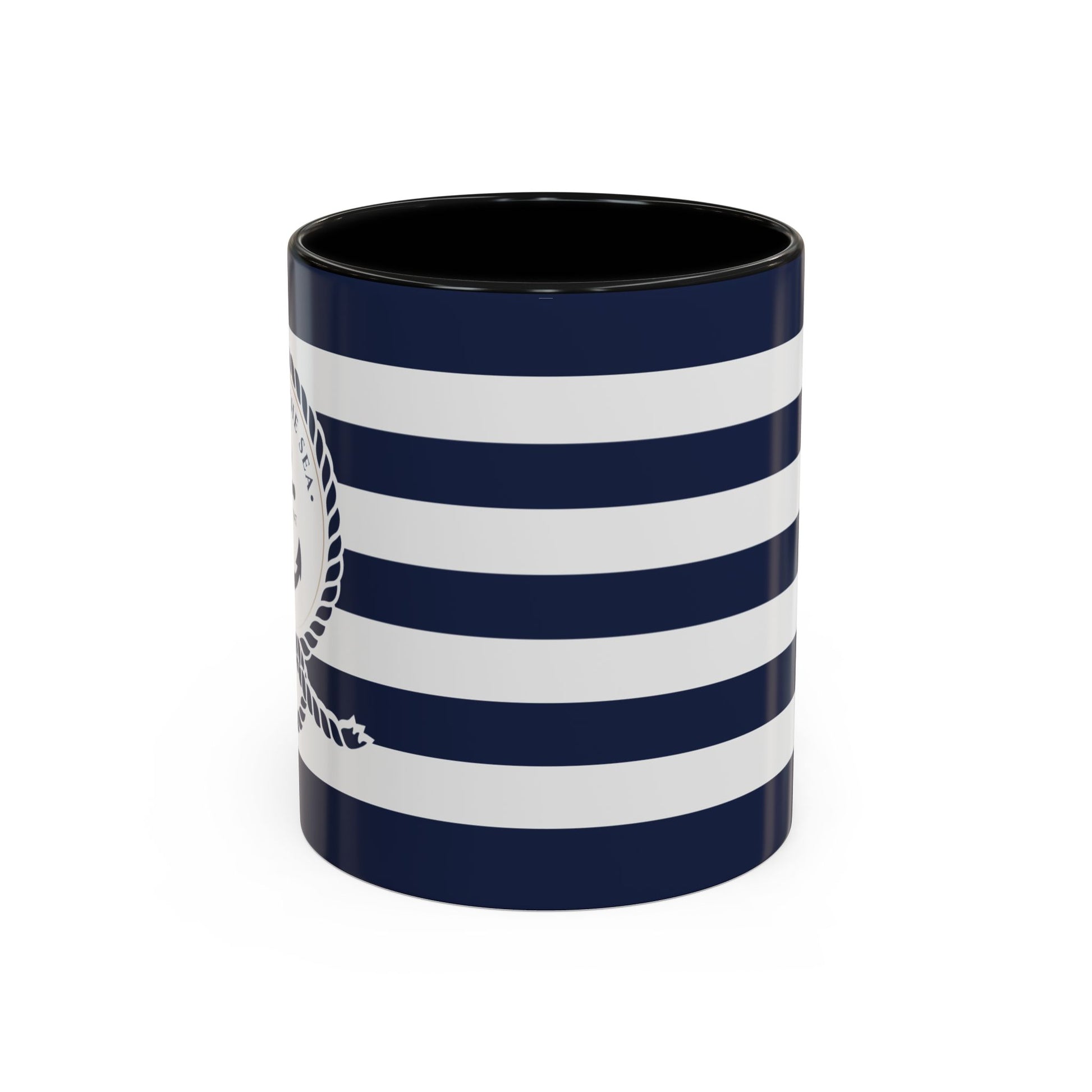 This ceramic accent mug brings a clean, nautical mood to slow mornings and busy desks. Bold navy and white stripes wrap the glossy surface while a contrasting black interior and handle add depth and edge. It feels familiar in your hands — sturdy C-shaped grip, smooth rim, and a bright finish that keeps the stripes popping day after day. Use it for your morning brew, afternoon tea, or as a small catch-all on a nightstand. The color contrast reads modern but relaxed, fitting in with coastal kitchens, home offices, and bookshelf displays.